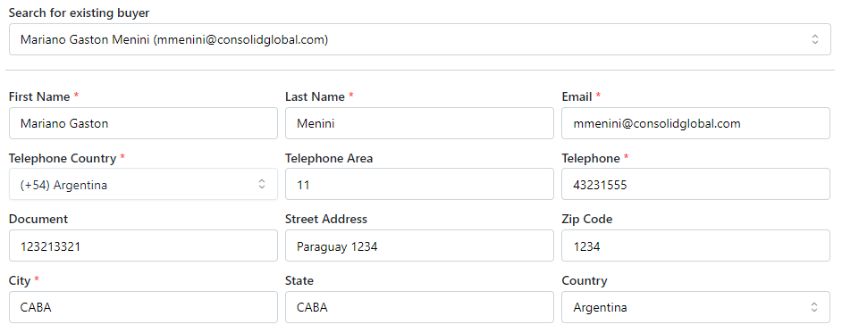 In the third step of the process, enter all the buyer's information. If this is the buyer's first transaction, all fields must be filled out manually. Otherwise, you can search for an existing buyer in the search bar, and the data will be loaded automatically.