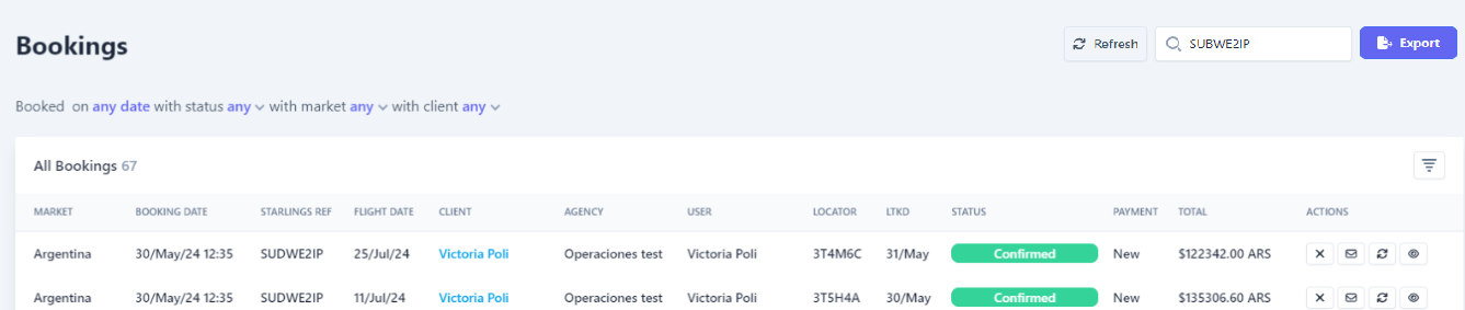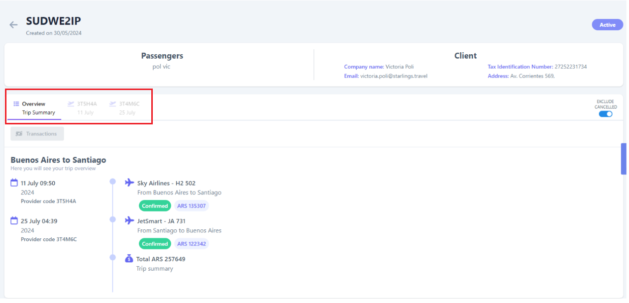 Once the reservation is confirmed, you can find it in Starlings > Bookings with its reference number. You can view the summary of the entire reservation as well as by segment by selecting the tabs at the top left.