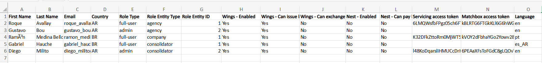 Once the file is downloaded, you must complete the list of users with all required data in each column (see column specifications).