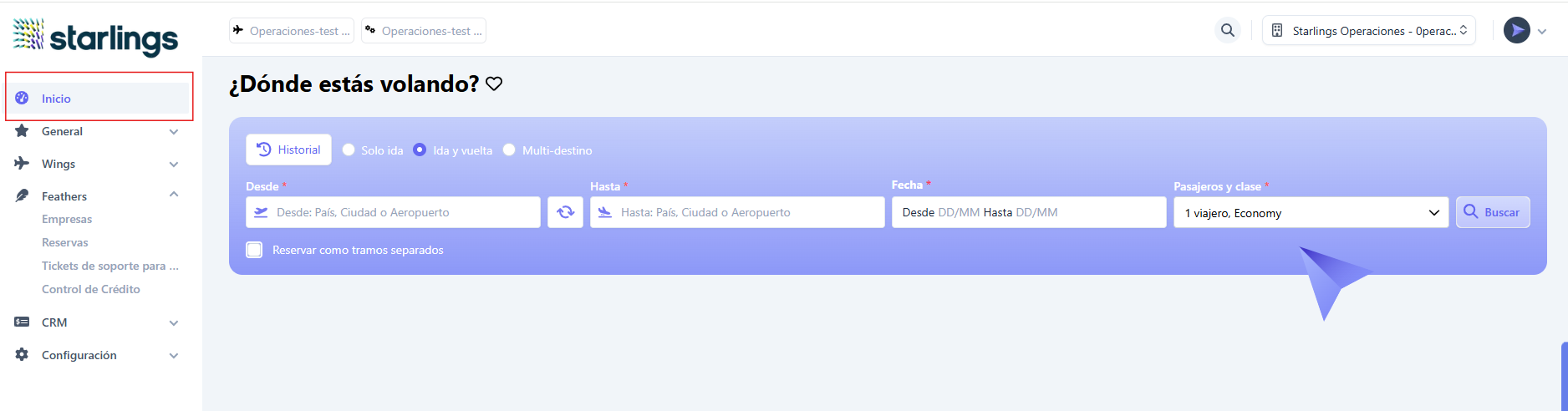 Al buscador de vuelos se accede desde el menú lateral izquierdo, opción "Inicio".