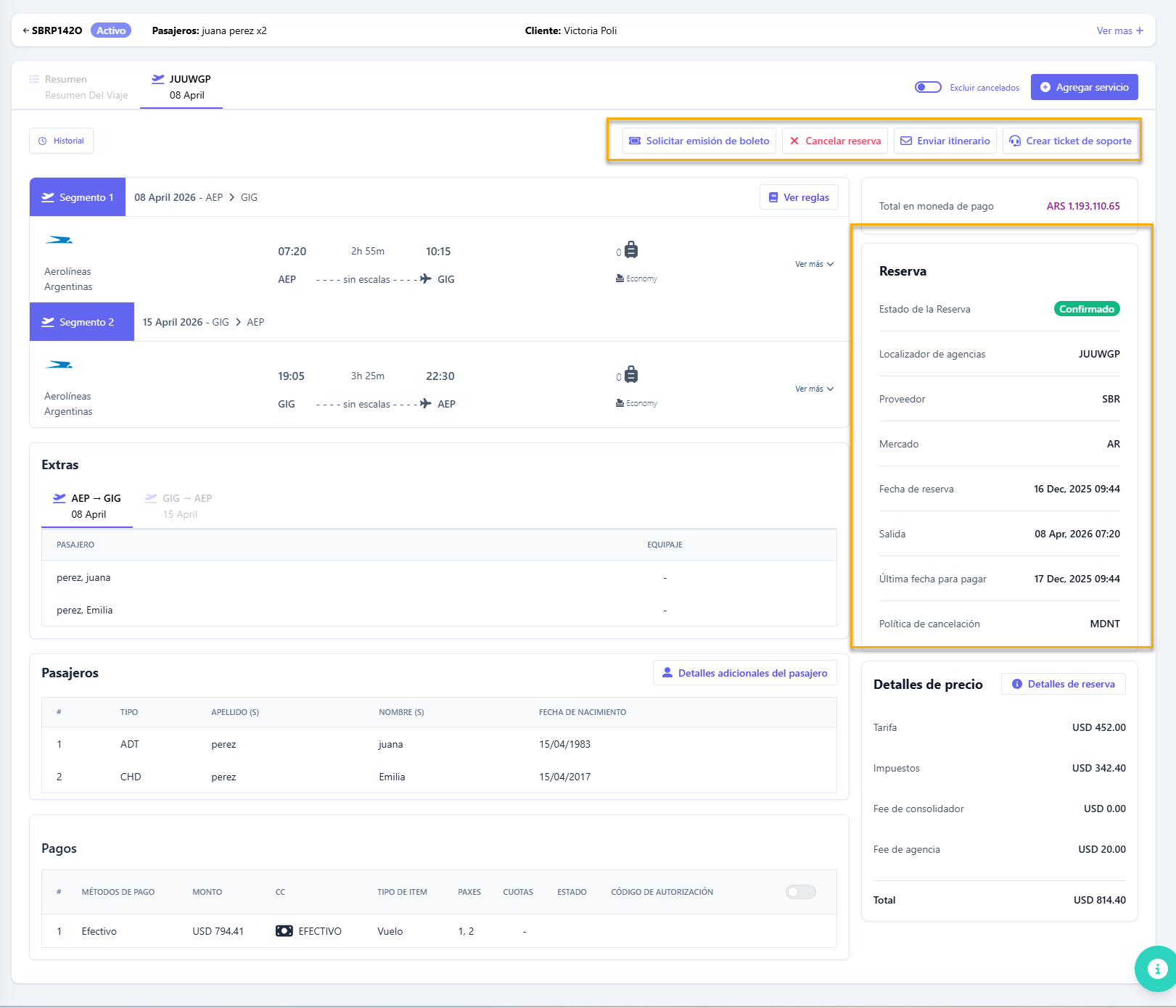 Desde allí es desde done se acciona sobre la reserva: emitir, cancelar, reemitir y reembolsar (si la compañia lo tiene activo).