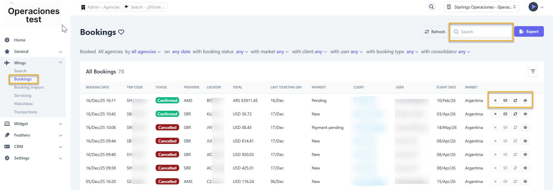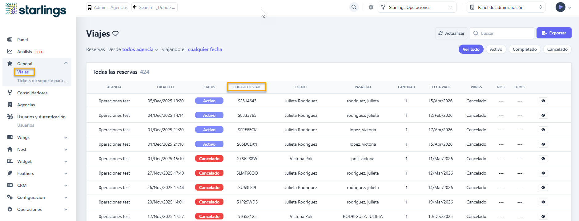 Esta sección presenta exclusivamente el listado de reservas de vuelos realizadas a través del módulo Wings.