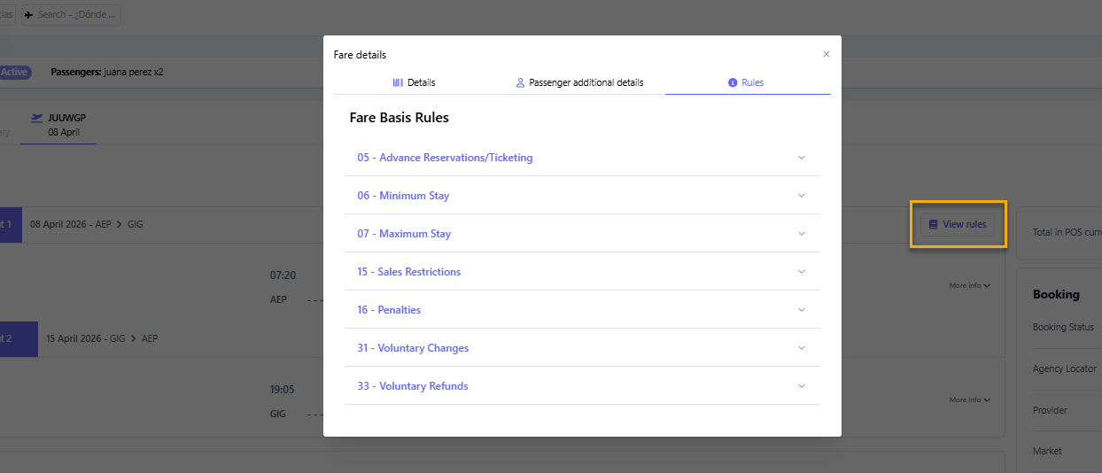 Ver reglas: condiciones tarifarias asociadas al ticket.