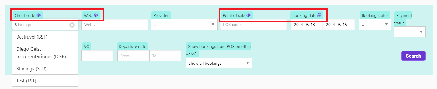 - Los filtros refinados permiten búsquedas precisas tipeando o buscando el filtro como Client Code, IDWeb, Punto de Venta. Tambien se puede buscar con fecha actual clicleando el ícono en Booking date.
