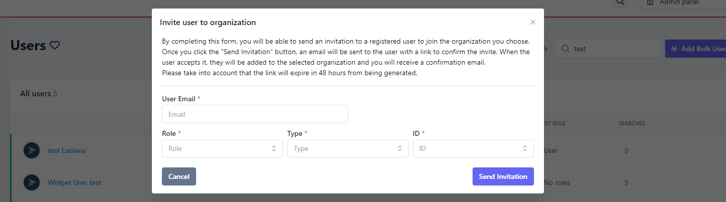 Al seleccionar el envío de invitación, se debe completar el mail del usuario y el rol que se quiera asignar.