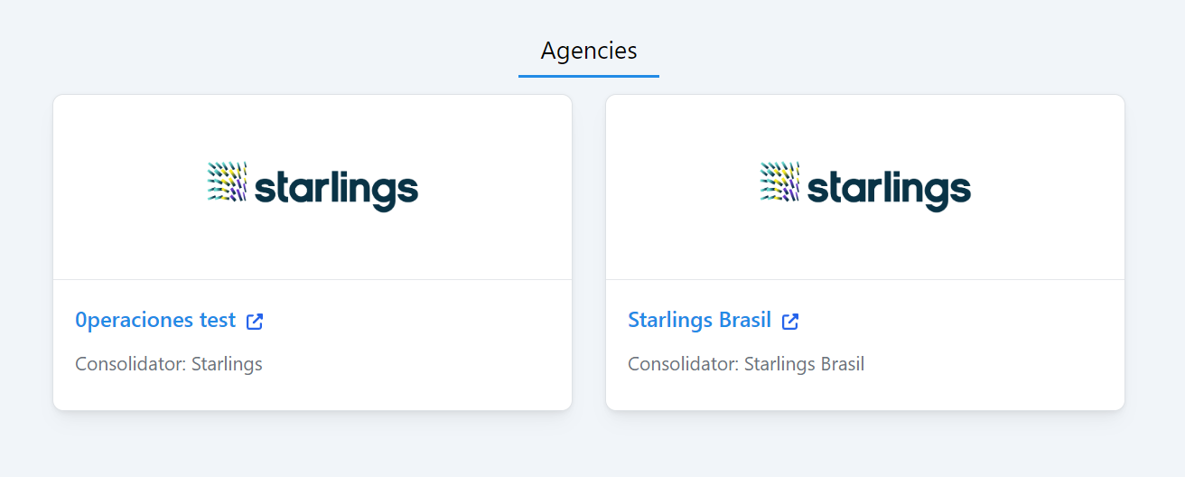 Cuando un usuario tiene asignada más de una agencia/consolidador, al ingresar de la plataforma, podrá seleccionar a cuál quiere ingresar. Se indicará el nombre de la agencia y su consolidador.
