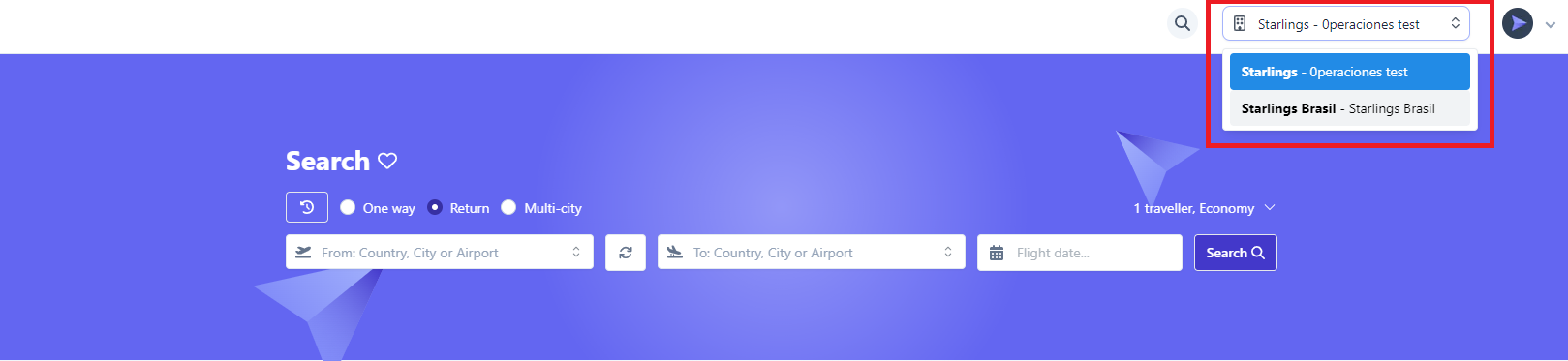 Una vez dentro de la agencia, podrá utilizar el selector que se encuentra en la parte superior derecha, para cambiar de agencia. Ahora se podrá visualizar el nombre de consolidador y agencia