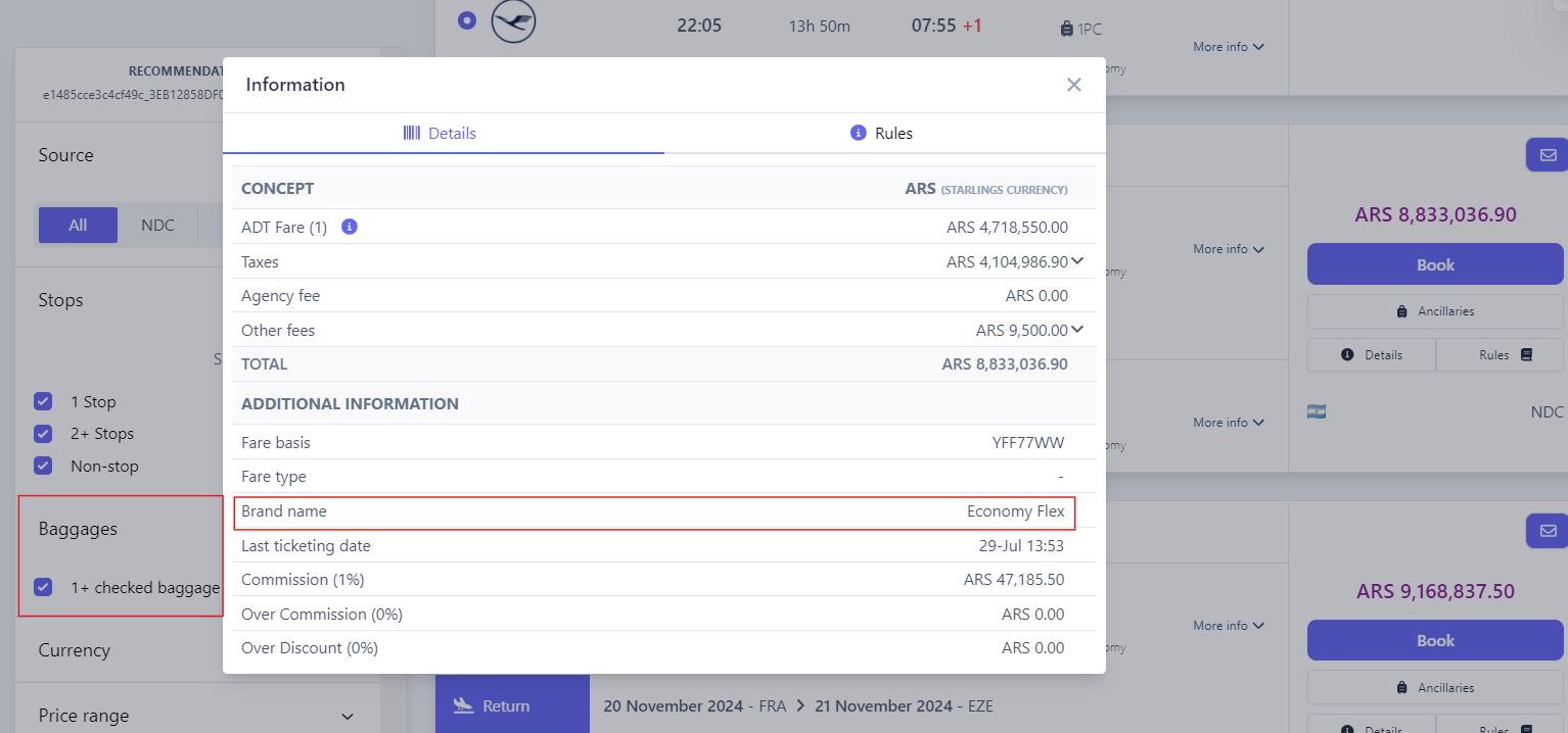 En la configuración de agencia, se puede habilitar la visualización, de forma discriminada, del monto neto de la tarifa en el resultado de búsqueda