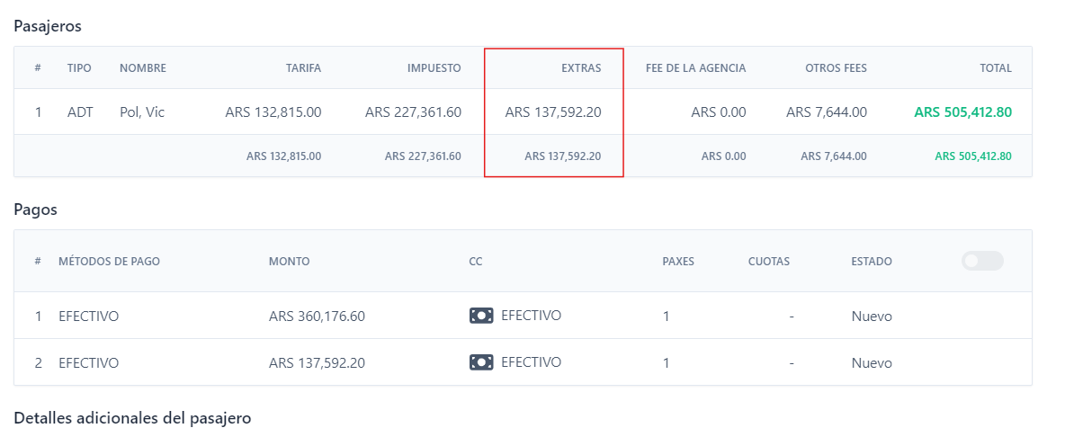 En el caso que no esten contratados, figurará un ícono de advertencia que indicará el detalle del ancillary que no fue confirmado.