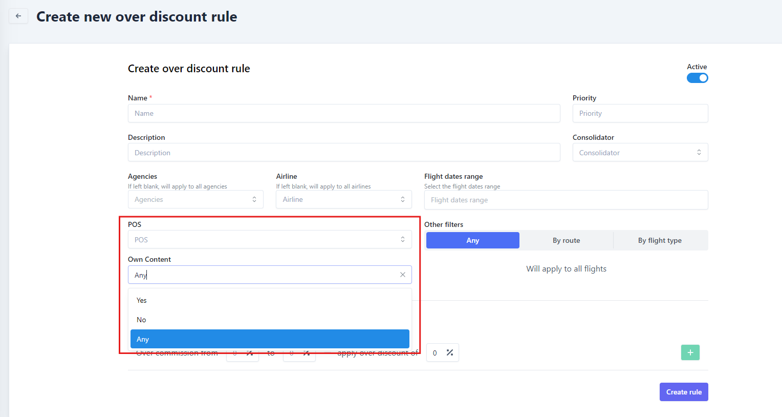 Importante: Para que una regla configurada con la condición "own content", aplique en reservas importadas (pnr import); se deberá indicar previamente desde la configuración del consolidador, si el PCC u OID es propio o no propio.