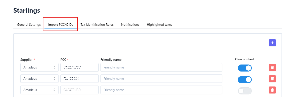 Uma vez no menu consolidador, clique em "+" para adicionar um novo PCC/OID e preencha com as informações do Fornecedor (por exemplo: Amadeus, Sabre) e o PCC/OID correspondente. Em seguida, clique em "atualizar" para salvar a nova configuração.