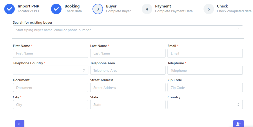 No terceiro passo do processo, insira todas as informações relacionadas ao comprador. Se for a primeira vez que o comprador estiver realizando uma transação, todos os campos deverão ser preenchidos manualmente. Caso contrário, é possível buscar um comprador existente na barra de pesquisa, e os dados serão carregados automaticamente.