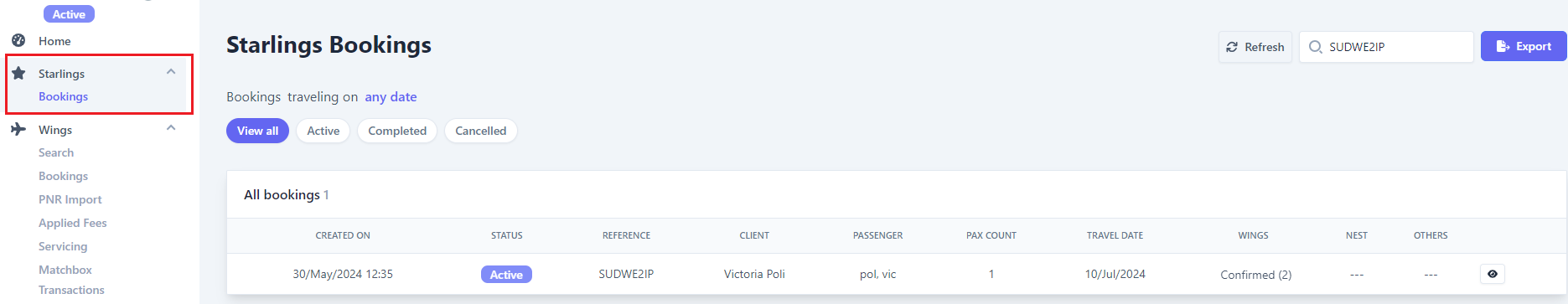 Para identificar ambas as reservas e realizar as gestões ou visualizações necessárias em cada uma delas, você pode pesquisar pelo "Starlings reference" na lista de reservas.