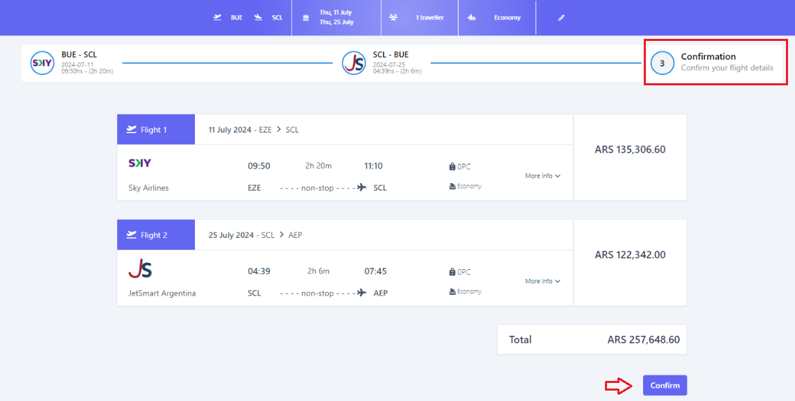 O processo de reserva estará dividido em etapas, permitindo que você selecione o voo desejado para cada trecho e finalize assim o processo de confirmação do voo completo.