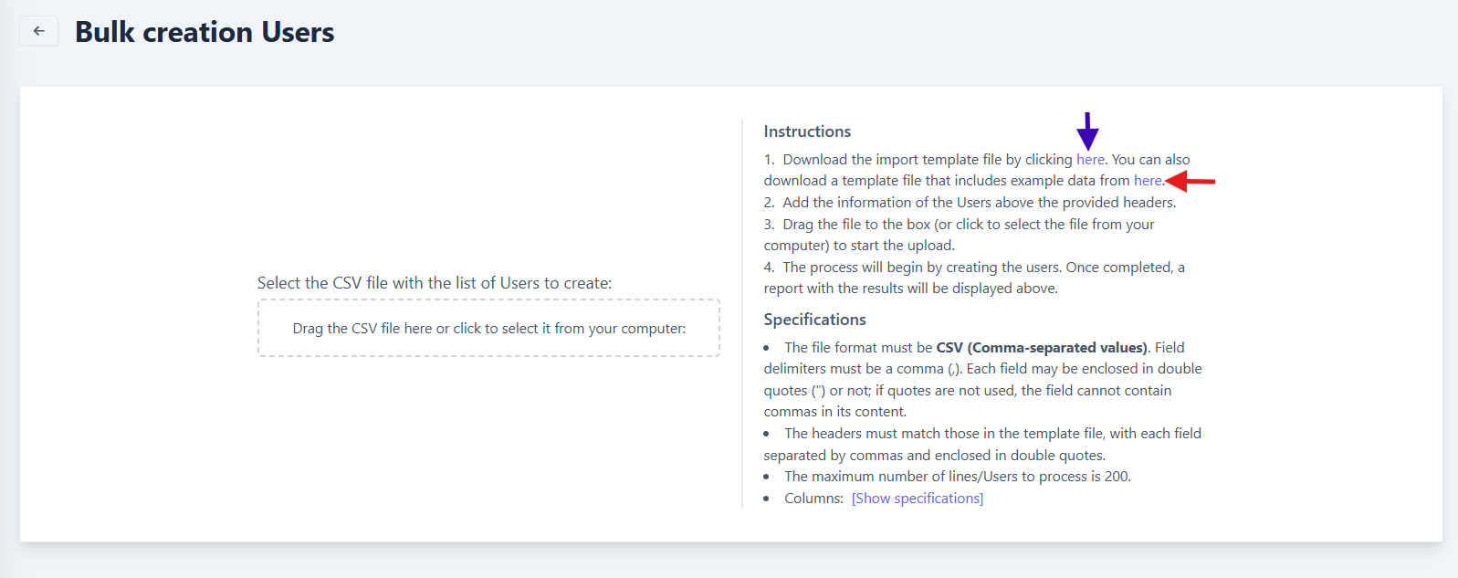 O upload em massa de usuários permite que eles sejam criados por meio da importação de um arquivo CSV.