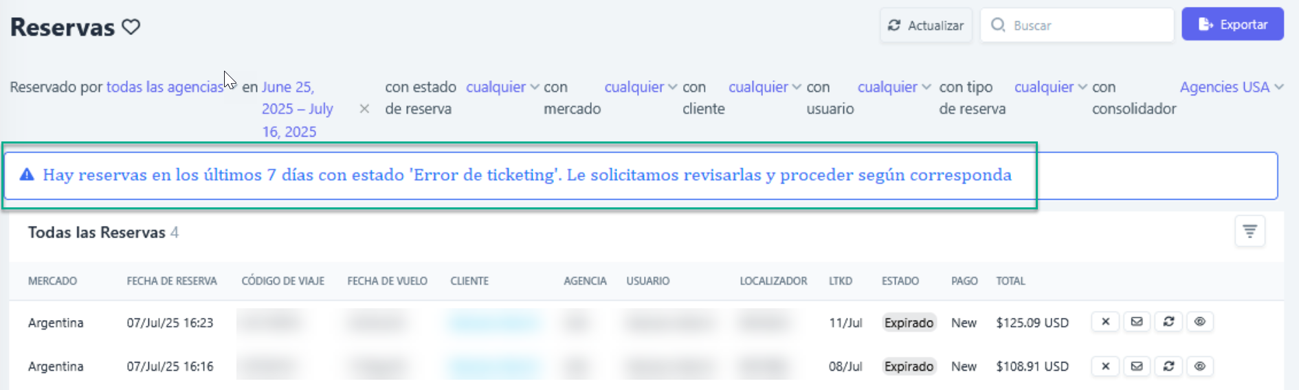 Usuários com papel de consolidator admin poderão visualizar, na lista de reservas, um aviso indicando a existência de reservas em status “Ticketing Error” nos últimos 7 dias.